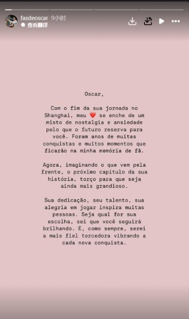 12月20日訊 奧斯卡的國(guó)外球迷團(tuán)體在社媒發(fā)告別信,稱(chēng)奧斯卡在中國(guó)的旅途即將結(jié)束。